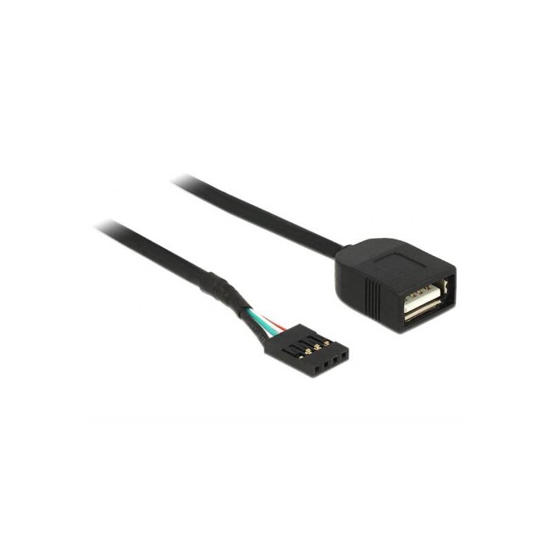 CAVETTO PER CONNETTERE UN DISPOSITIVO USB CON CONNETTORE A AD UN CONNETTORE INTERNO SULLA PIASTRA MADRE.CONNETTORE: 4 PIN USB 2.0 PIN HEADER > USB 2.0 TIPO A FEMMINA PIN HEADER: ROSSO = VCC (+5 V) VERDE = DATA+ (D+) BIANCO = DATA- (D-) NERO = GND (GROUND) PER CONNESSIONE INTERNA LUNGHEZZA CIRCA 40 CM.