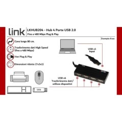 HUB CON 4 PORTE USB 2.0, VELOCITÀ DI TRASFERIMENTO HIGH SPEED FINO A 480 MBPS. HOT PLUG & PLUG AND PLAY, GIÀ PRONTO PER IL COLLEGAMENTO GRAZIE AL CAVO USB INCLUSO. DI DIMENSIONI MOLTO COMPATTE, SI PUÒ USARE ANCHE DURANTE UN VIAGGIO, IN BORSA COL NOTEBOOK, ECC.GRAZIE AL SUO CAVO DA 80 CM HA UN'OTTIMA VERSATILITÀ DI POSIZIONAMENTO.PER WINDOWS E QUALUNQUE SISTEMA OPERATIVO SUPPORTI LO STANDARD USB. NON NECESSITA DI ALIMENTATORE ESTERNO, SI ALIMENTA DIRETTAMENTE DALLA PORTA USB.MISURE CM 7X3X1 COLORE NERO