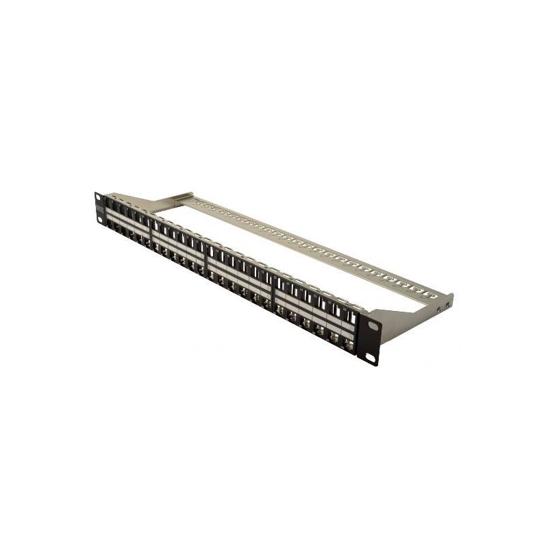 PANNELLO PATCH PER PRESE KEYSTONE MATERIALE DELLA CUSTODIA: SPCC, ACCIAIO AL CARBONIO LAMINATO A FREDDO DA 1,5 MM SECONDO JIS G3141-1996 SPAZI ETICHETTE TRASPARENTI SUPPORTO MODULI IN METALLO, PER MODULI UTP E STP.ADATTO PER MONTAGGIO A STAFFA 483MM (19'') OCCUPA SOLO 1 UNITÀ COLORE NERO RAL9005 ADATTO PER MODULI RETE CATEGORIA 5E, 6 E 6A PORTE: 48