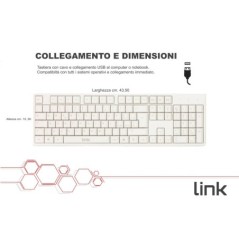 TASTIERA CON SCHEMA TASTI ITALIANO, CAVO CON CONNETTORE USBDIGITAZIONE CONFORTEVOLE E SILENZIOSA GRAZIE AI SOTTOTASTI CON DOPPIA MOLLADESIGN ELEGANTE, TASTI SILENZIOSI, PROFILO BASSO, TASTIERA NUMERICA DI DIMENSIONI STANDARD E TASTI FUNZIONEE' SUFFICIENTE COLLEGARE LA TASTIERA TRAMITE LA PORTA USB A UN PERSONAL COMPUTER DESKTOP O A UN NOTEBOOK ED È GIÀ PRONTA PER L'UTILIZZO, COMPATIBILE CON TUTTI I SISTEMI OPERATIVII TASTI HANNO UNA STAMPA DUREVOLE CHE NE PREVIENE LO SCOLORIMENTOCOLORE BIANCOCON LED PER INDICARE LO STATO DELLA TASTIERAMISURE: CM 43,50 X 12,50